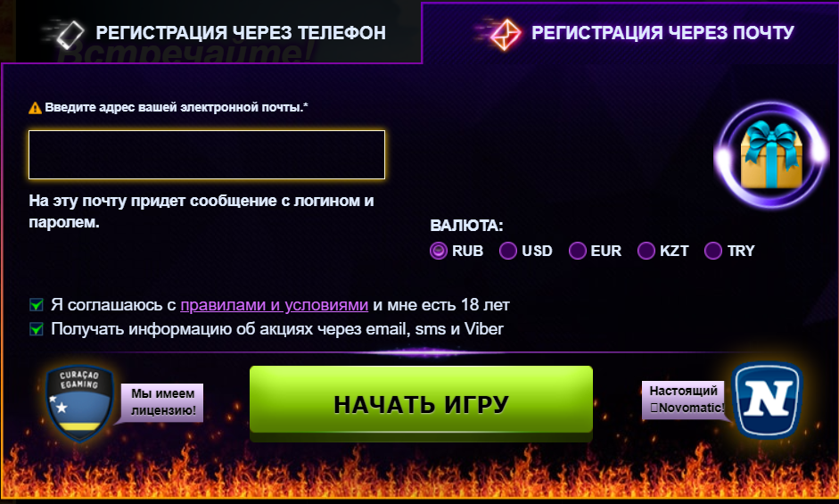 Пользователю предстоит указать адрес e-mail. На него поступит информация с логином и паролем для дальнейшего входа. Помимо этого, клиенту требуется определиться с валютой — USD, KZT, EUR, RUB, TRY. Обязательно нужно подтвердить, что будущий игрок ознакомился с правилами портала, условиями пребывания на сайте. Галочка в пункте с получением информации об акциях через Вайбер, смс, электронную почту ставится по желанию.